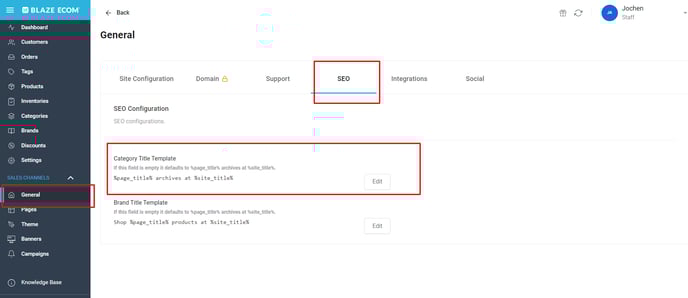 To implement the page titles of ECOM category pages, navigate and log into ECOM Mission Control. Navigate to General > SEO. There you will find the setting to control the ECOM Category Page Titles.