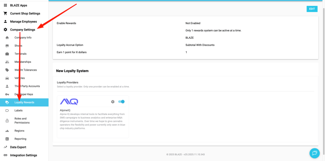 BLAZE Loyalty will show as connected as long as you have a loyalty service configured in the POS. That is where you can enable the native loyalty service as well as integrate with our partner services. You'll manage this with the POS > Global Settings > Company Settings > Loyalty Rewards