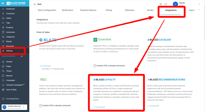 BLAZE Loyalty will automatically show as connected in Mission Control Settings > Integrations once any loyalty service is active in your POS